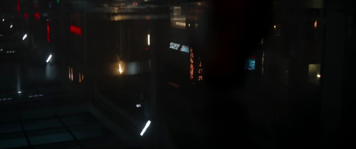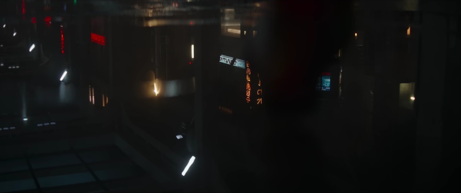 Shot 12: Nighttime on an urban planet. We see reflections of neon lights and signs in a puddle on the ground. One of the signs reads “SPICE" (basically the Star Wars equivalent of drugs) in Aurebesh. The one next to it reads “THE DEN." A boot steps into frame and into the puddle, disturbing the water as its owner walks away from the camera. Before the foot steps in, another neon sign reads “Halcyon: See the Galaxy" in Aurebesh, referencing the now-defunct Star Wars: Galactic Starcruiser at Walt Disney World.