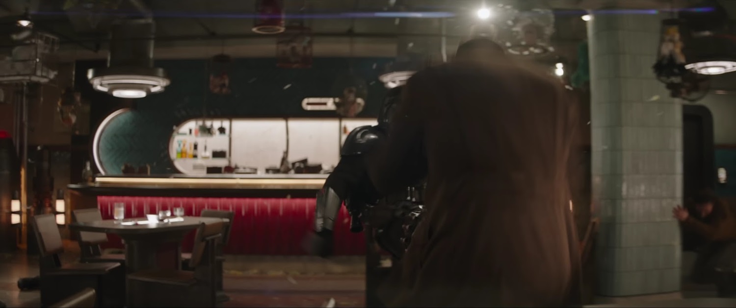 Shot 13: We’re in a seedy bar, presumably on the same planet. Din Djarin kicks an opponent toward the camera. The bar is otherwise empty except for one other patron who hides behind a pillar in the background.