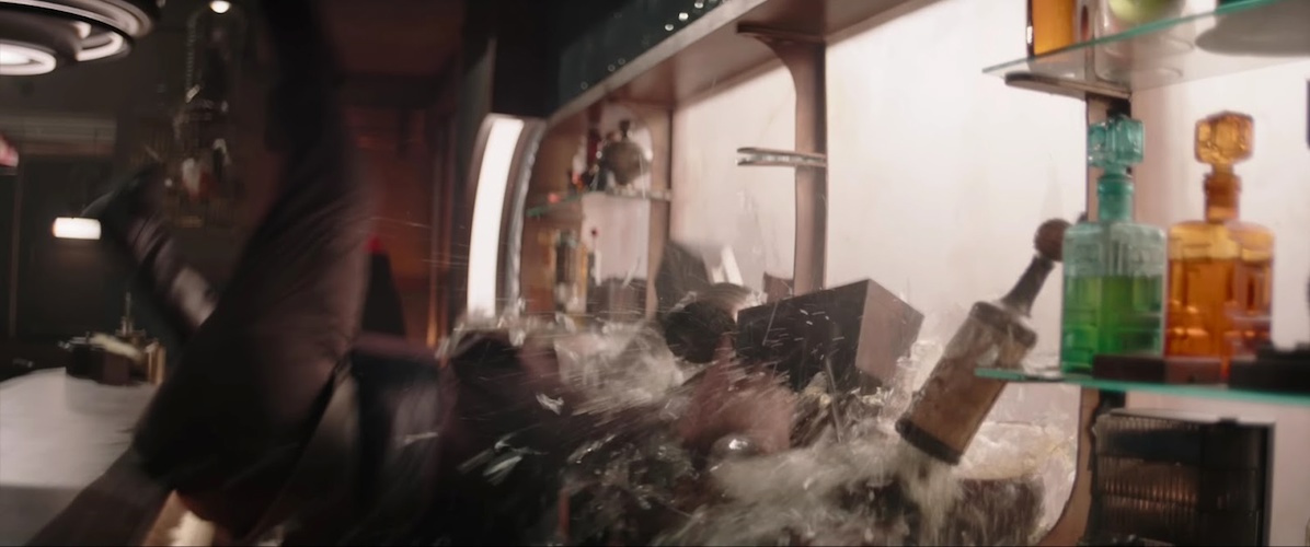 Shot 14: In the following shot, the recipient of Din’s kick goes flying into a wall full of drinks, shattering the glass shelves.