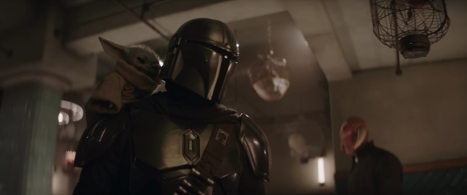 Shot 15: Still in the bar, Grogu jumps onto Mando’s shoulder. Odd-looking light fixtures or cages hang all around, while a patron of the Iktotchi species stands in the background. Iktotchi first appeared in Star Wars: Episode I - The Phantom Menace, and is most famously represented by Jedi Master Saesee Tiin.