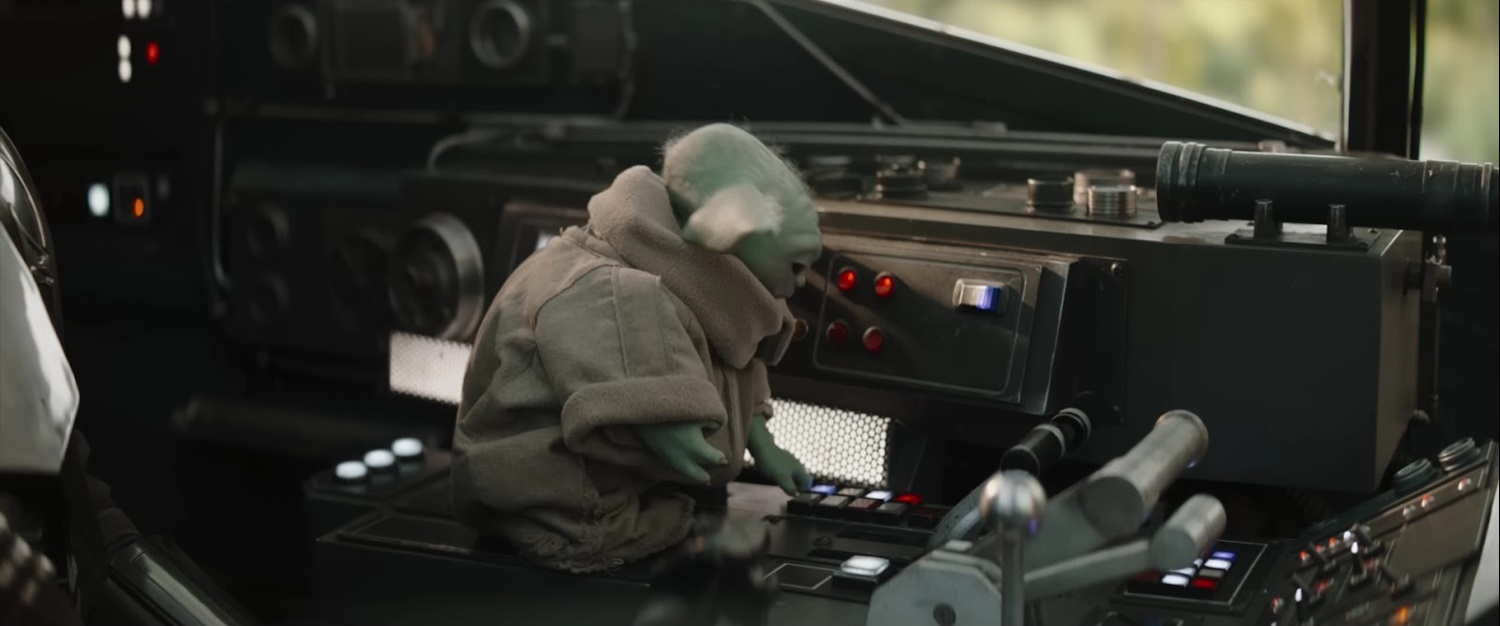 Shot 17: Grogu monkeys with the controls in the Razor Crest.