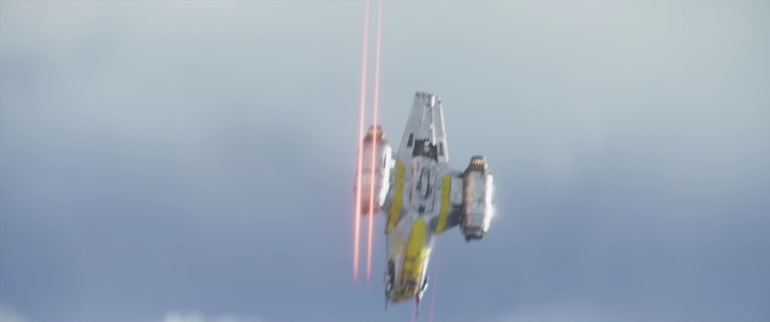 Shot 21: We get a very quick look at the ships pursuing the Razor Crest as three of them zip past the camera in quick succession. They’re going so fast that it’s difficult to determine their exact model, but I do want to point out that in Star Wars, Imperial TIE fighters are usually depicted as firing green laser blasts, while these ships’ laser fire is red in color.