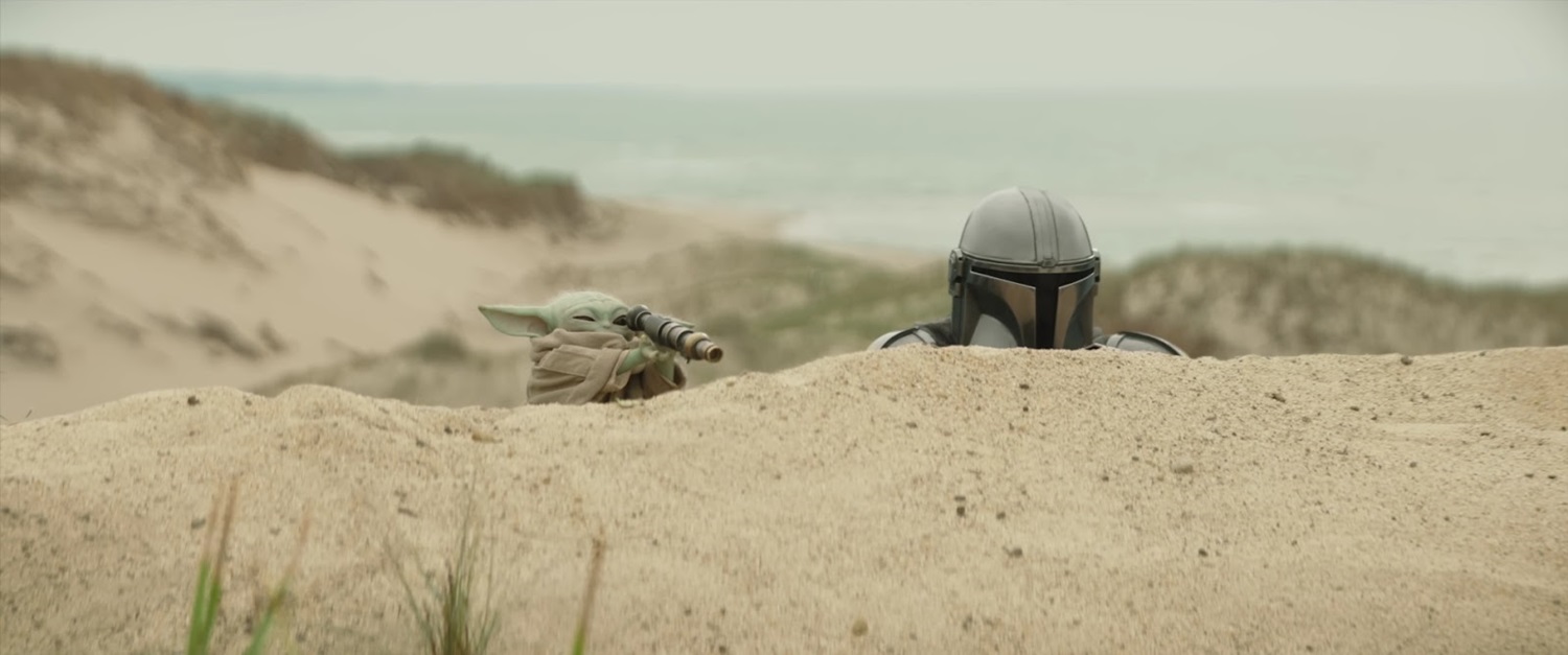 Shot 2: Grogu peers through a scope while he and Din (played by Pedro Pascal / Brendan Wayne / Lateef Crowder) look over a dune, apparently also on Adelphi. Grogu murmurs something baby-like.