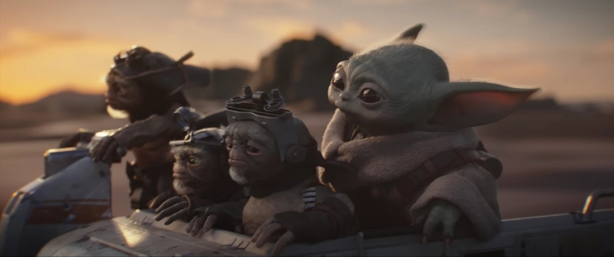 Shot 25: Grogu rides in a little sidecar with some Anzellans as another drives the speeder. Adorable! It’s unclear what planet this is on, but there are some cliffs in the background.