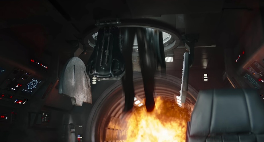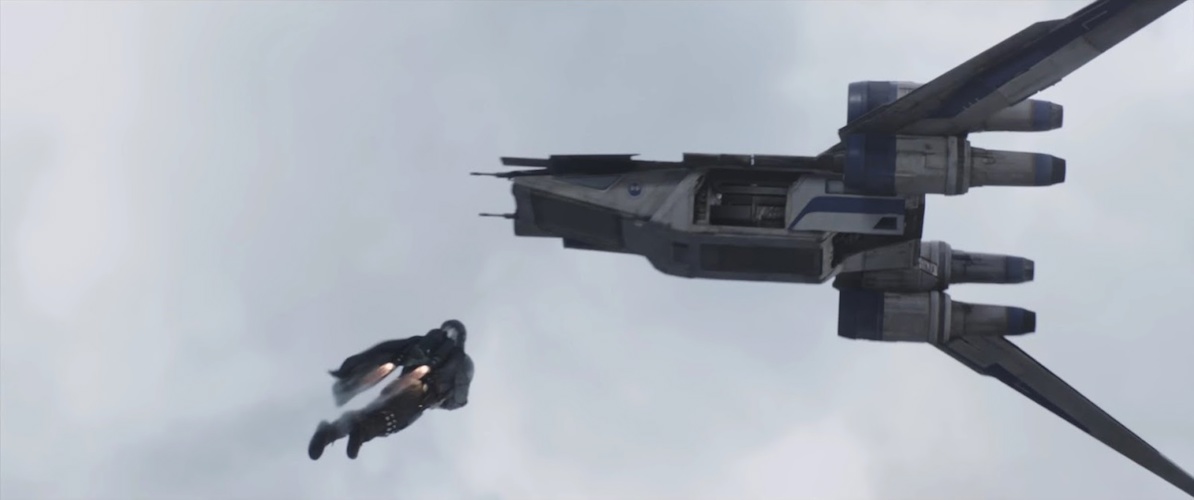 Shot 26: Using his jetpack, Din Djarin rockets up toward a U-wing starfighter (first seen in Rogue One: A Star Wars Story) as its side door slides open. It looks like Din is carrying Grogu as well.