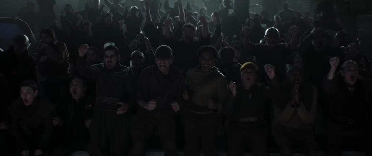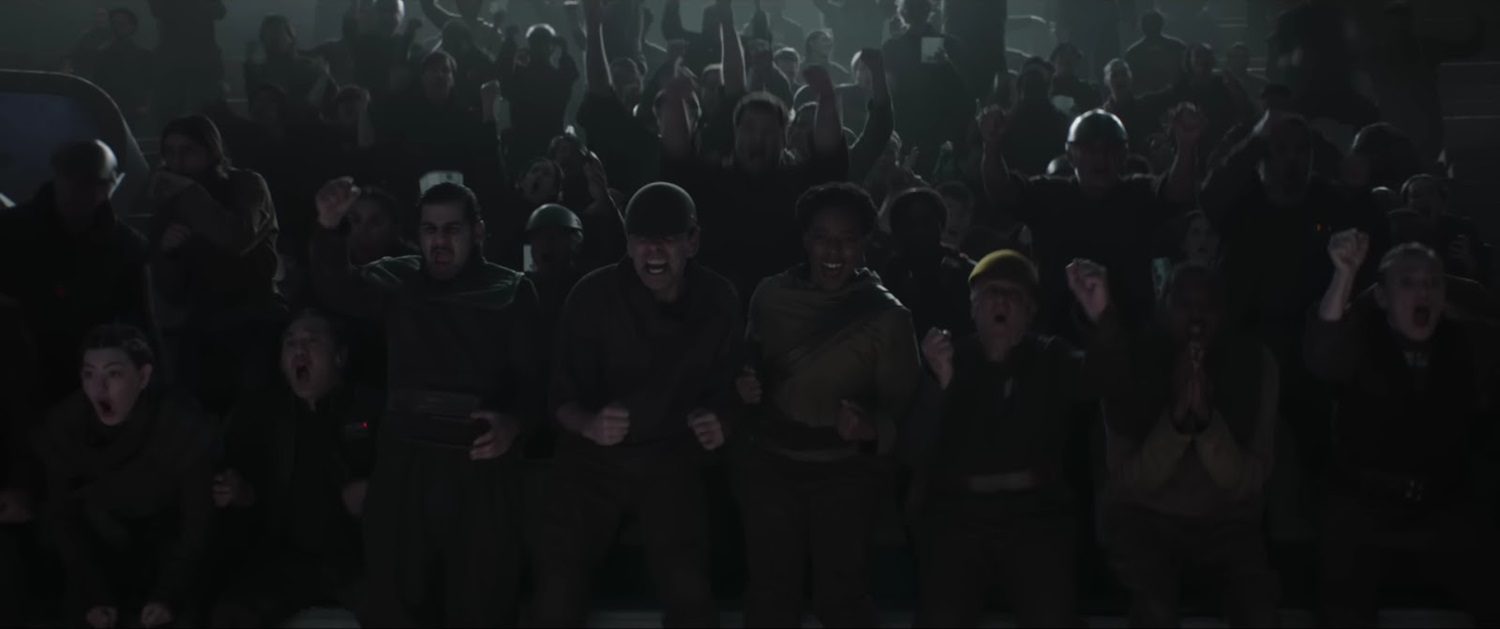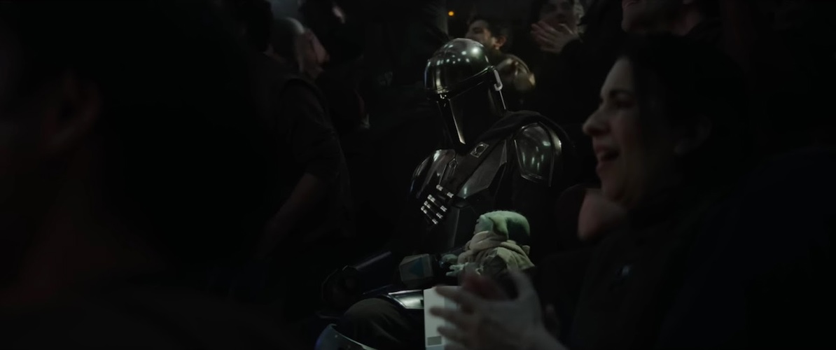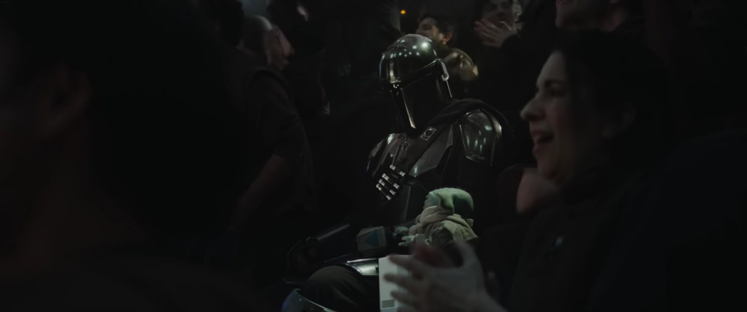 Shot 29: Looks like Din and Grogu are seated in the arena as well, with cheering fans all around them.