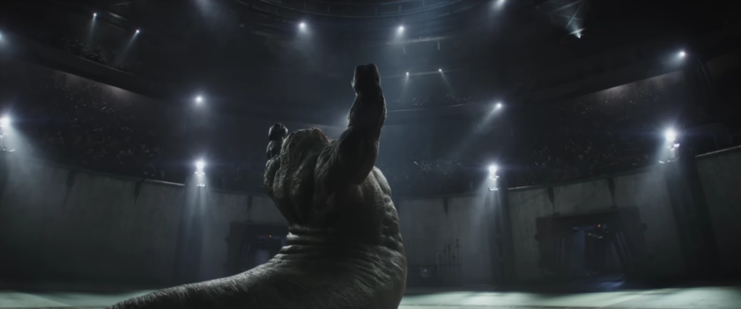 Shot 33: Pretty neat– this huge creature is a Mantellian Savrip, first seen represented as a piece in the Holochess game Dejarik aboard the Millennium Falcon in the original Star Wars film. This partnered with what could be Mantell Mix in a previous shot leads me to believe that Rotta’s arena might be on the planet Ord Mantell (first mentioned by Han Solo in The Empire Strikes Back).
