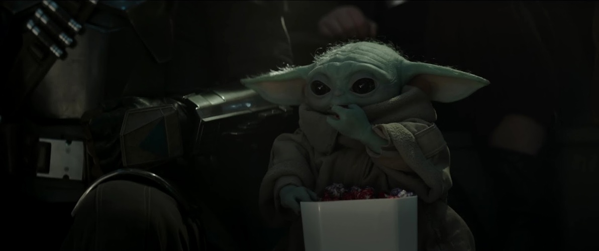 Shot 30: Grogu munches on some popped grain that looks similar to the Outpost Mix you can get at Star Wars: Galaxy’s Edge or the Mantell Mix we’ve seen in Star Wars: The Bad Batch.