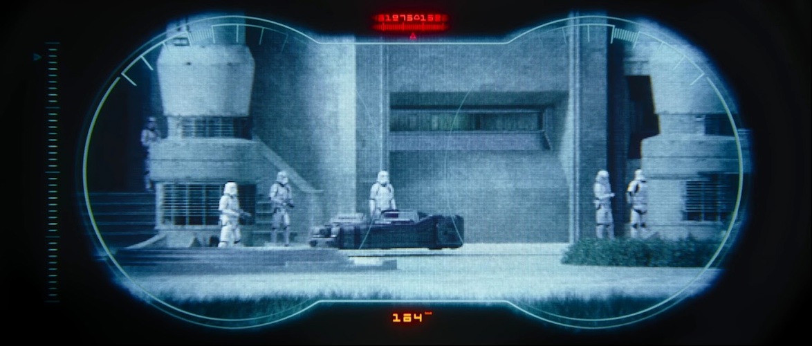 Shot 3: The trailer wants us to think this is Grogu’s POV, but I’m not so sure. This looks like someone’s view through a pair of macrobinoculars, not through a monocular scope. And I don’t know if I believe this is Adelphi base we’re looking at (perhaps being occupied by the Imperial remnant), but my guess is that it’s a different location from another part of the movie. Stormtroopers hang around a large structure and a speeder.