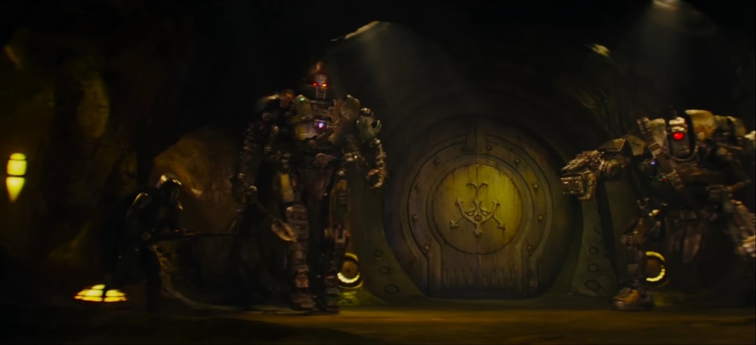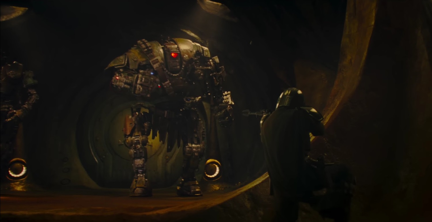 Shot 31: Din fights a pair of enormous droids (or are these mech suits?) in what I assume to be the bowels of Rotta’s arena. That’s the Hutt Cartel insignia on the vault-like door in the background.