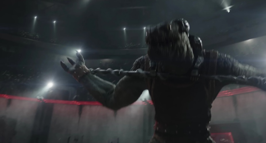 Shot 34: Din Djarin has somehow stumbled his way into fighting the Savrip in the arena.