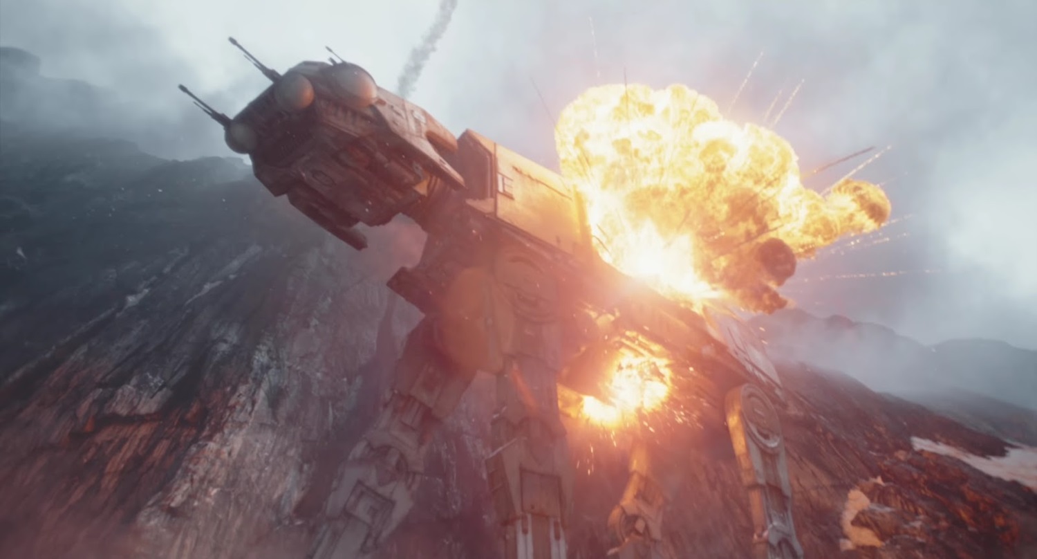 Shot 36: The AT-AT explodes as Din and Grogu jetpack off-screen. It’s not clear what planet we’re on, but there are some snowy cliffs.