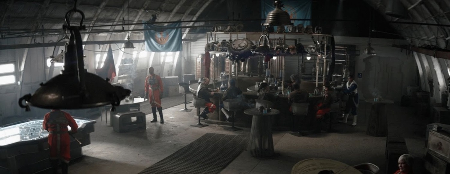 Shot 7: Now Mando has taken the seat next to Grogu, and we get a better look at the background, further establishing this as Adelphi base. The Rebel Alliance / New Republic insignia hangs on a flag over a table with some rangers congregating.