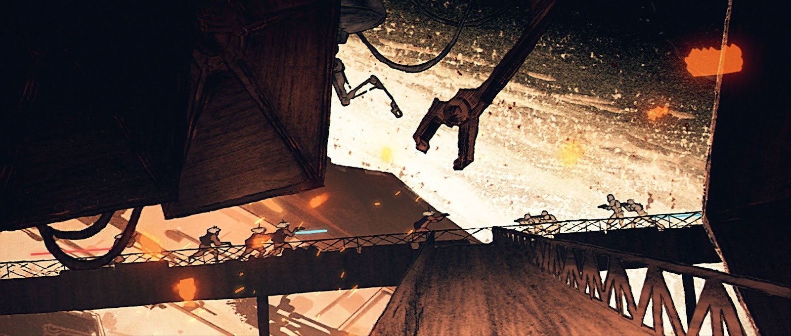 There have been Star Wars stories from the stormtroopers’ perspective before, with the opening of The Force Awakens being the most prominent example. But “Black” isn’t just a reversal of the point-of-view we’re used to in A Galaxy Far, Far Away. It’s something far more, and I can absolutely see returning to it time and time again in an effort to decipher its often abstract and evocative imagery. There’s no straightforward narrative here other than “hurry up and die for the Empire” but that’s part of what makes it so compelling: much like the other Visions shorts, it uses the familiar Star Wars iconography– the uniforms, the spaceships, the laser blasts– to ground us in what we already know about this universe, and then pulls us inward to the unreal, hellish day-to-day of the Galactic Civil War as it must appear to the mind of a grunt on the front lines. In a strange way, I could almost see “Black” as playing as a companion piece to Andor, humanizing and empathizing with the stormtrooper in a way that live-action series never felt the need to do. Politics aside, in the heat of combat I imagine it could start to feel like everyone is a victim, chess pieces manipulated by the powers that be on a bloody battlefield littered with grave sites. That’s what this film manages to get across, and ultimately the expressive nature of “Black” is what makes it stand out as the pinnacle– so far– of what Star Wars: Visions can be.