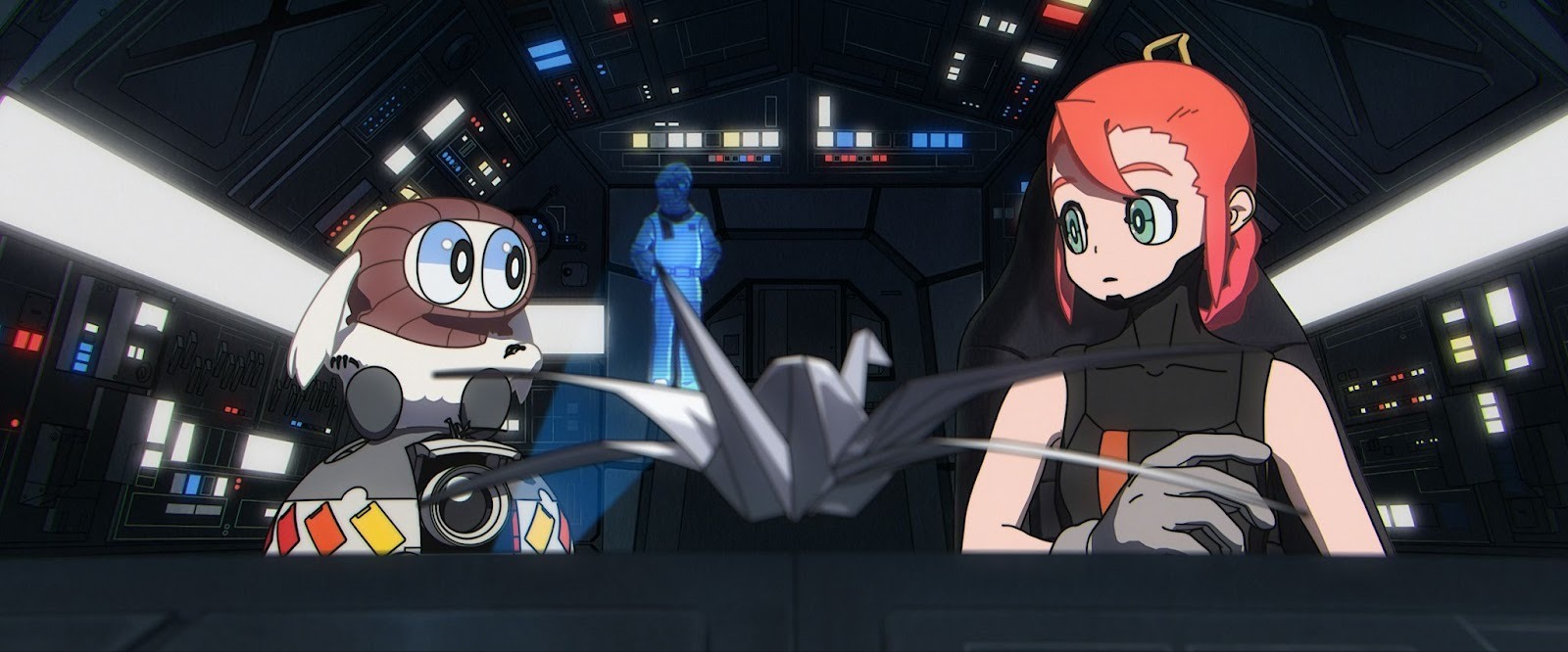 “The Song of Four Wings” is a very simple story using the iconography and themes of the Star Wars saga, but its simplicity is a big part of what makes it work. Its narrative focuses on a young human princess named Crane (voiced by Stephanie Hsu in the English dub) who does not like being referred to as “princess” anymore now that her kingdom has been destroyed by an Empire. She reports to a hologram of the Mon Calamari Admiral Basil Kiucee (Trevor Devall) as she speeds through a snowy landscape with only her astromech droid by her side. Crane is on a reconnaissance mission to investigate the ruins of another village ravaged by the Empire, and after she arrives there she discovers an orphaned infant Gigoran named Woopas (Aki Toyosaki) who we soon learn has a connection to the Force. Yes, this animated short shares some DNA with The Mandalorian, but as we’re well aware that live-action series borrowed from the Japanese Lone Wolf and Cub manga and films, it all washes out in the end.