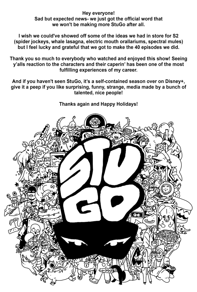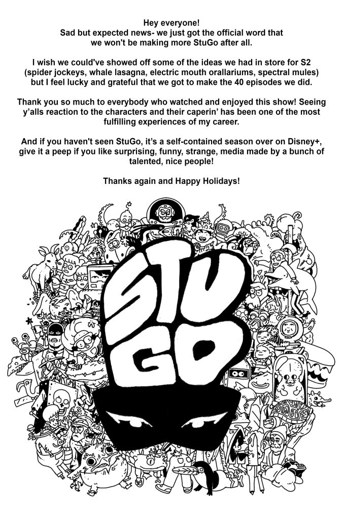 - In his post, Gillis said “Hey Everyone! Sad but expected news - we just got the official word that we won’t be making more StuGo after all. I wish we could’ve showed off some of the ideas we had in store for S2 (spider jockeys, whale lasagna, electric mouth orallariums, spectral mules) but I feel lucky and grateful that we got to make the 40 episodes we did. Thank you so much to everybody who watched and enjoyed this show! Seeing y’alls reaction to the characters and their caperin’ has been one of the most fulfilling experiences of my career. And if you haven’t seen StuGo, it’s a self-contained season over on Disney+, give it a peep if you like surprising, funny, strange, media made by a bunch of talented, nice people! Thanks again and Happy Holidays!“