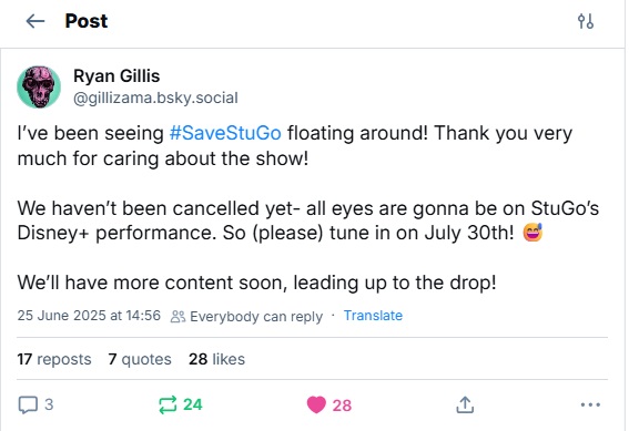 A small update from creator Ryan Gillis confirms the worst has not yet officially happened to StuGo, but to get more episodes, we all need to watch it again when it arrives on Disney+ next month.