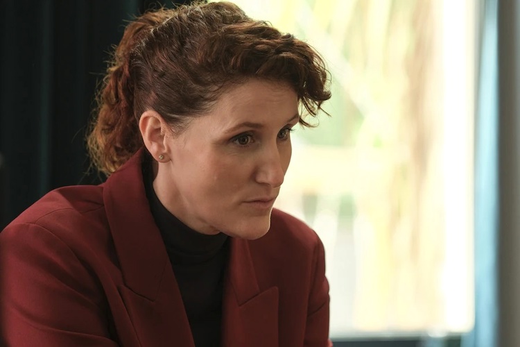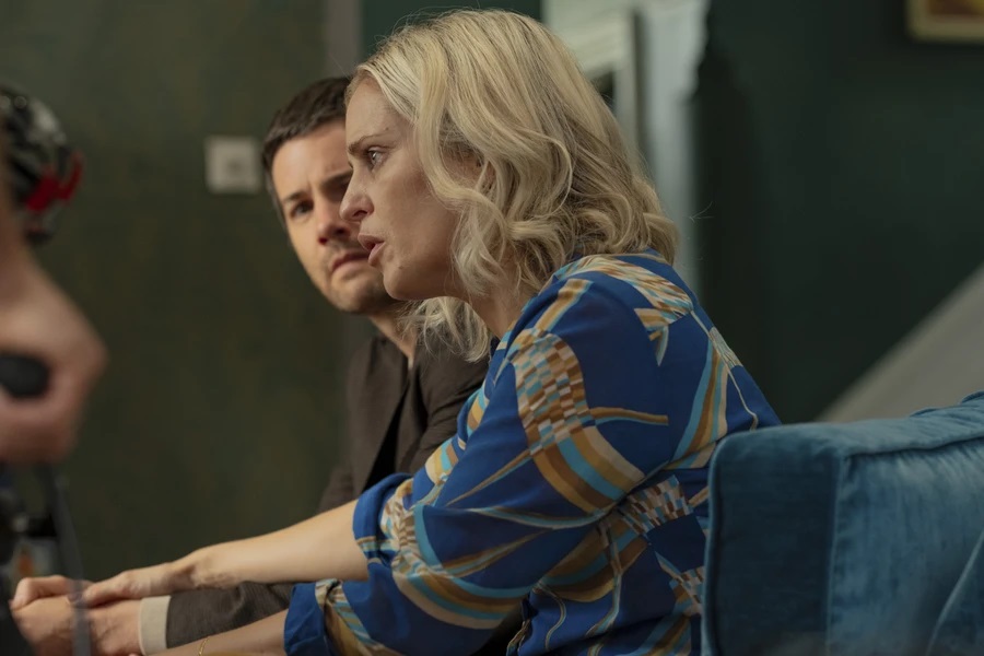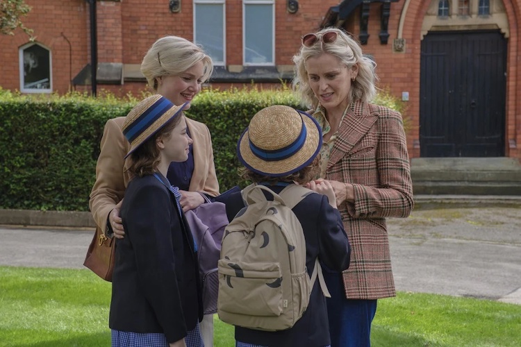 Quickly after, we are introduced to our main character Elisa Blix. Standing on top of a balcony in a tropical hotel, she makes her way down to the beach where she scrolls through pictures of her husband, Fred and two children, Lucia and Georgie on her phone. Noticeably absent from the pictures, Elisa sits alone, a smile rests on her face. Now, strutting down the hotel hallway, we get our first look at Elisa’s career as a flight attendant for private jets. While her life looks glamorous initially, once landing back in Cheshire, Elisa quickly has to re-enter Mum mode as she races to her daughter’s school for pick up.
