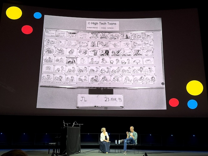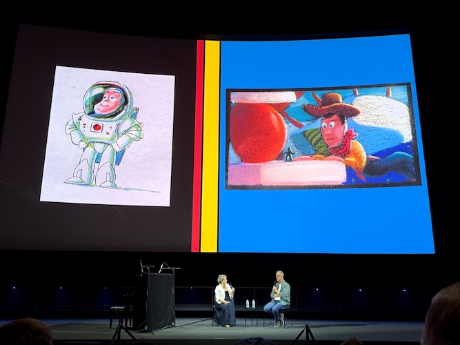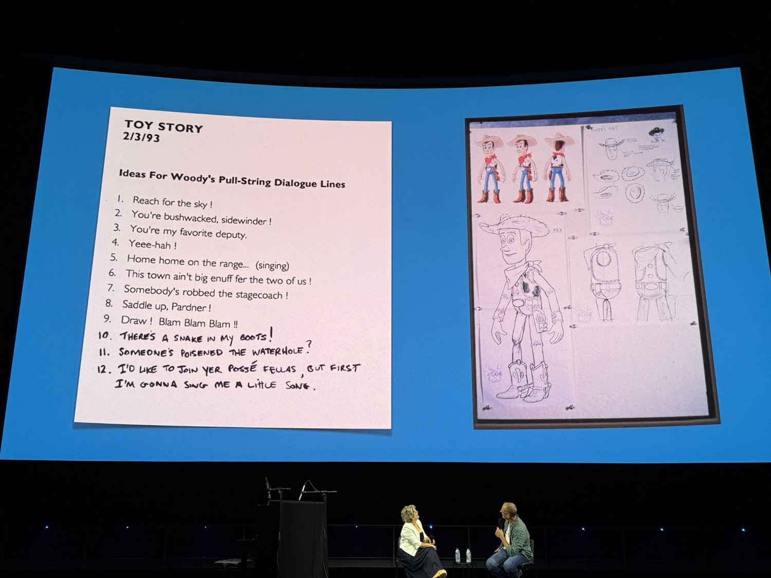 Pete Docter fondly remembered Tom Hanks’ first recording session as Woody: “He nailed the pull-string lines right away. We were laughing so hard they kicked us out of the room." One of the slides showed the list of pull-string lines the writers wrote ahead of the recording session, with hand-written additions that came up during the session, some of which were Hanks’ own improvisations.