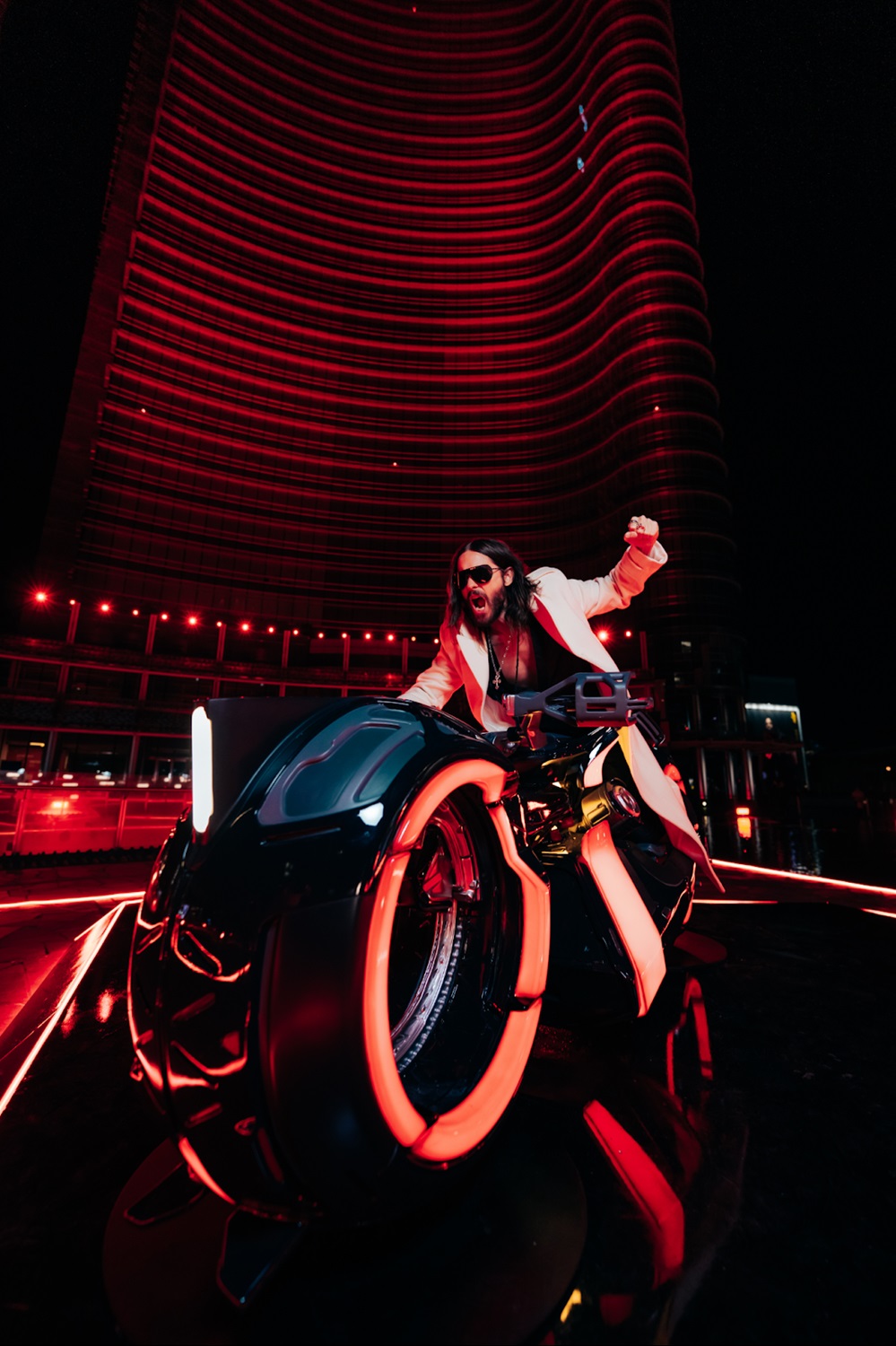 - Meanwhile, Leto, who also serves as a producer on the film, hopped on board a lightcycle for an equally-as-fun photo op.