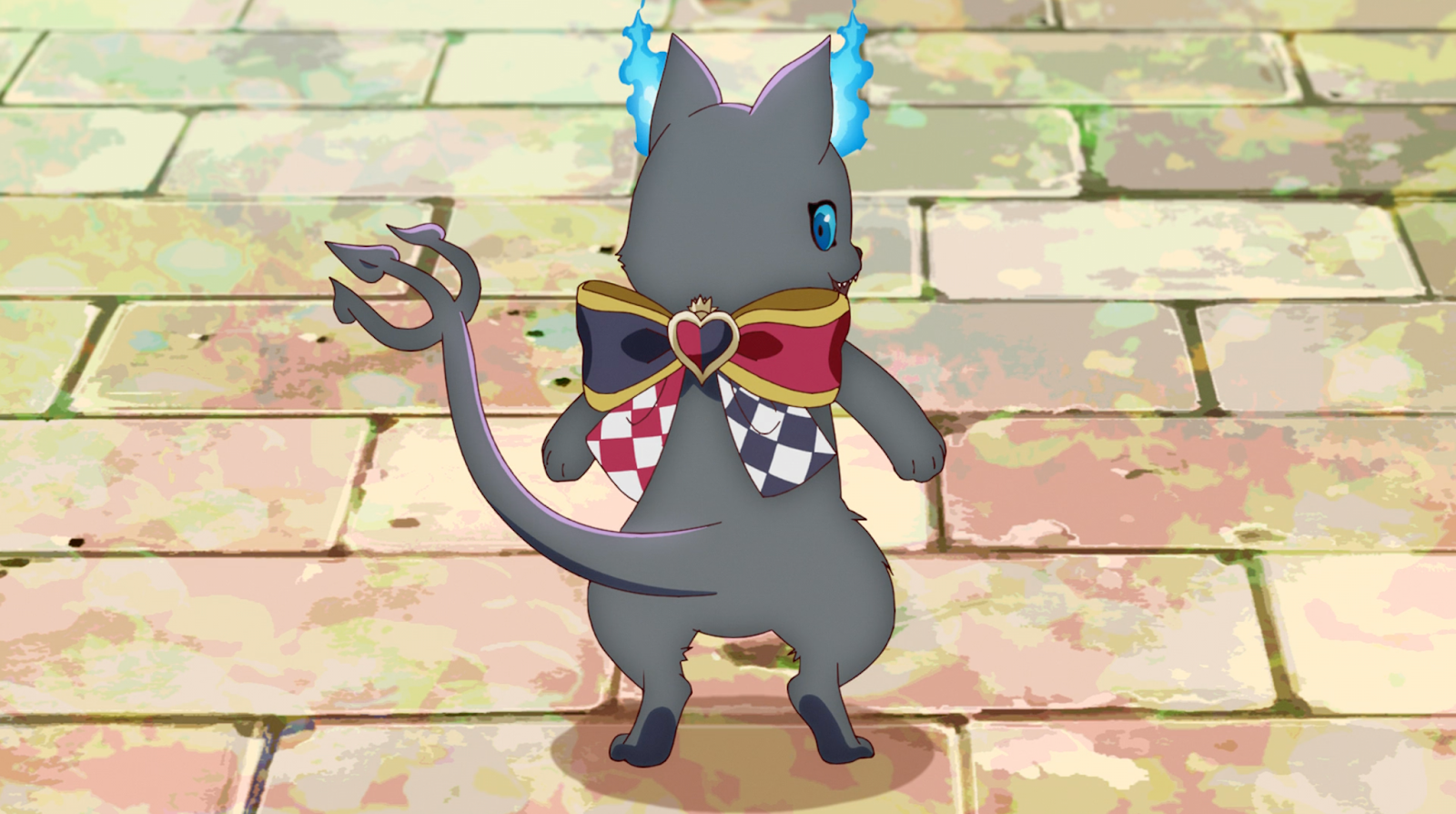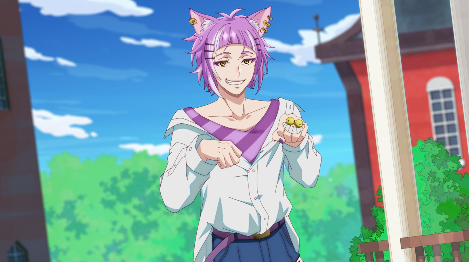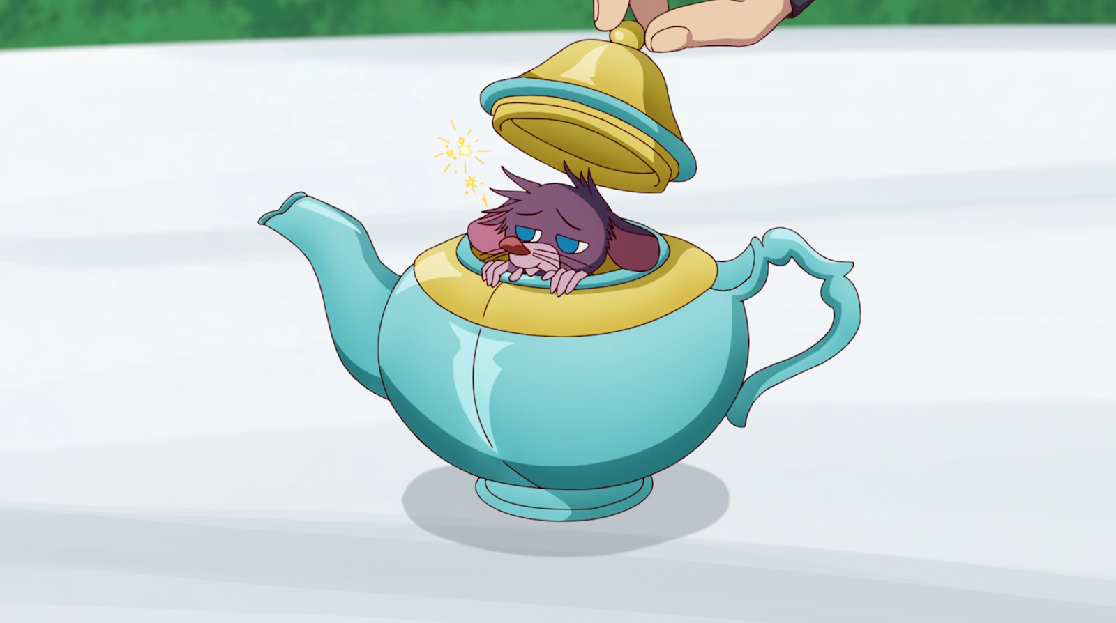 The boys sit around the Heartslabyul gazebo when a floating head appears. “You all look so dashing in your little collars,” the purple cat-eared boy tells them, spooking Grim. The rest of his body appears, and he introduces himself as Artemiy Artemiyevich Pinker, aka Chenya (Kento Hama/Daman Mills). He reveals that he was a childhood friend of Riddle’s, asking them to talk to “four eyes,” meaning Trey, about Riddle’s past. Having caused enough mischief, Chenya disappears the way he arrived, humming “Twas Brillig.”