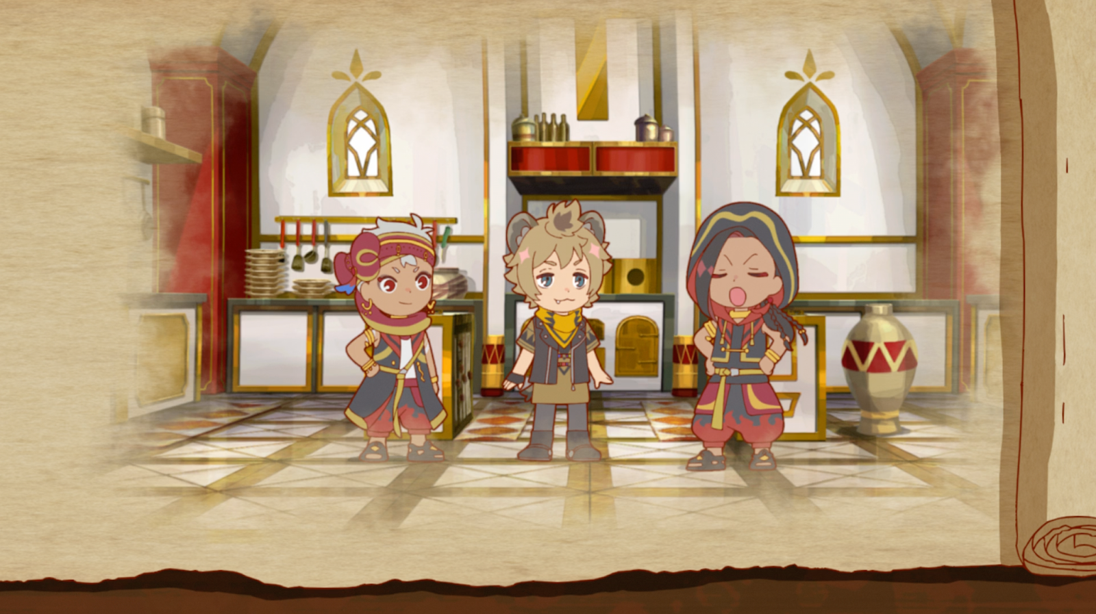 This week’s chibi short takes place in Scarabia House. Houswarden Kalim Al-Asim (Kazuki Furuta/A.J. Beckles) has been inviting other students over nonstop to feast on delicious food prepared by Jamil Viper (Kaname Futaba/Nazeeh Tarsha), who puts his foot down as Ruggie Bucchi (Aoi Ichikawa/Zeno Robinson) from Savanaclaw arrives, starving and with empty containers to take leftovers home. Kalim decides to try cooking for the first time, and Ruggie begs Jamil to take over before Kalim ruins all the food. In the end, we see Jamil exhausted, bullied into cooking a feast for Ruggie, who takes a huge sack of food home with him.
