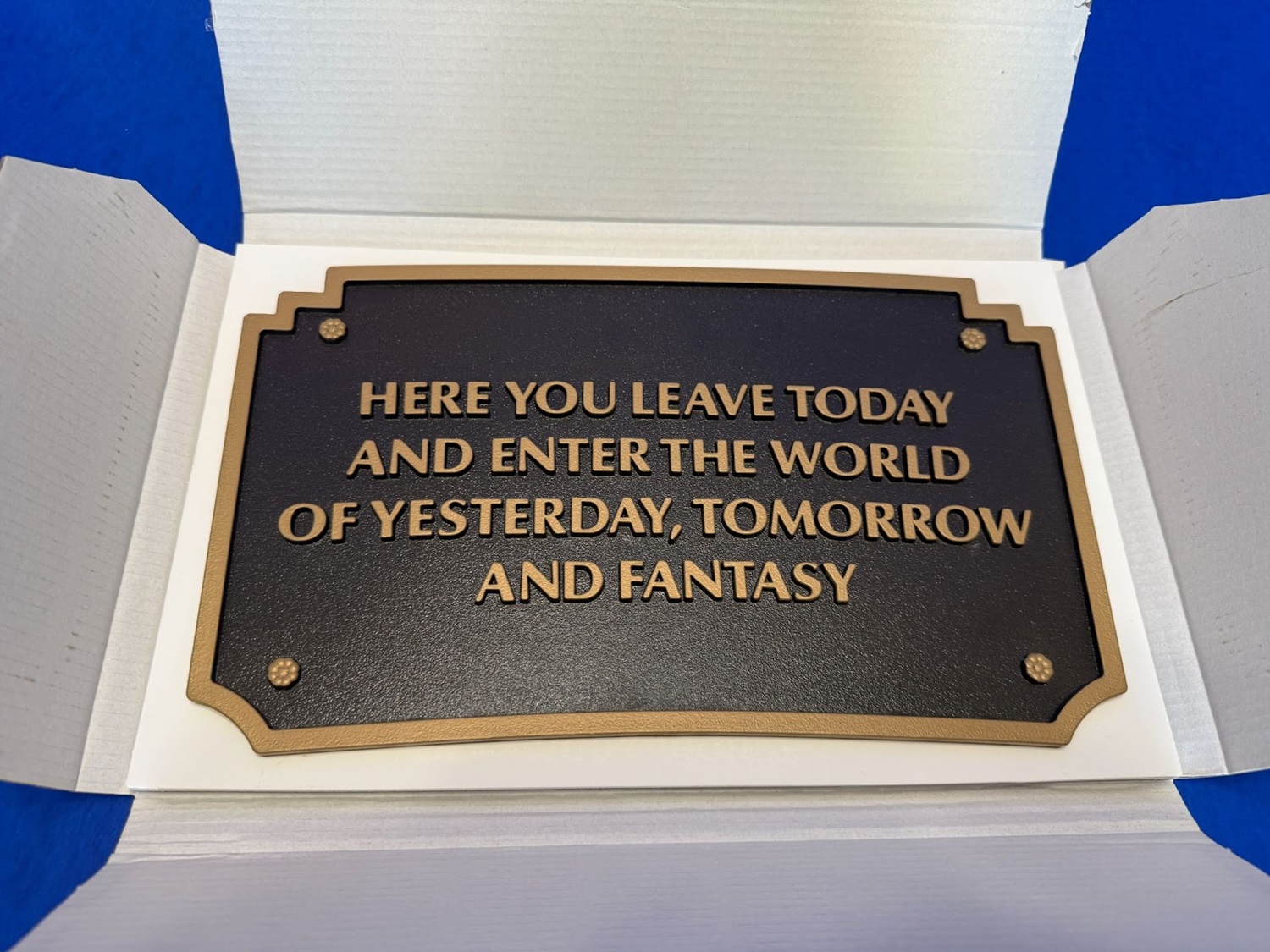Meant to be hung, the back of the plaque has a hook that can make guests in your home feel like they, too, are entering “the world of yesterday, tomorrow, and fantasy."