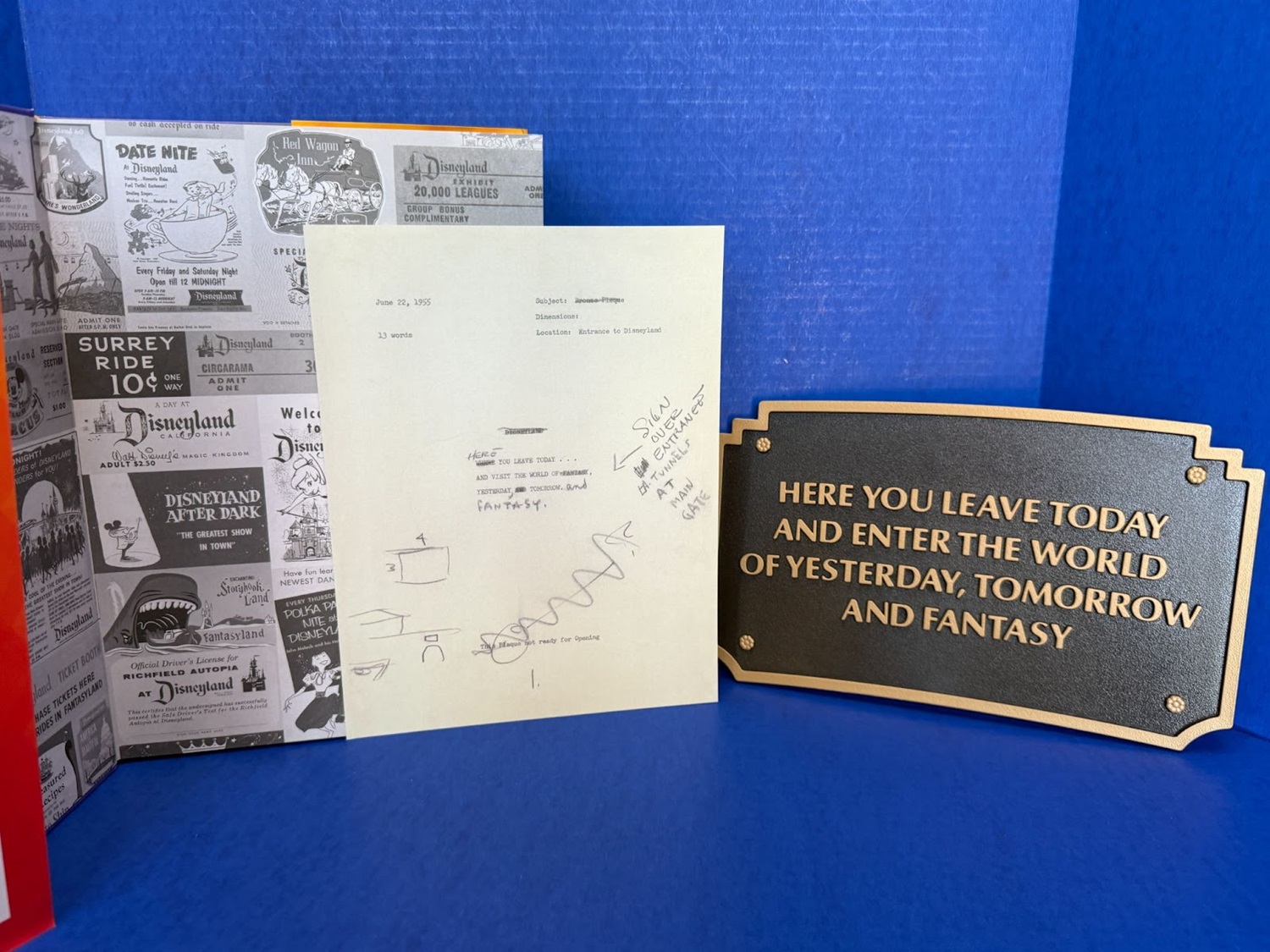 Housed inside the book is a paper bonus, a facsimile of the plaque’s draft, with Walt Disney’s annotations. The back of this also explains the historical significance of the plaque, not only to Disneyland, but to all the theme parks Disney has since built in its image, each of which has its own version of this iconic welcome.