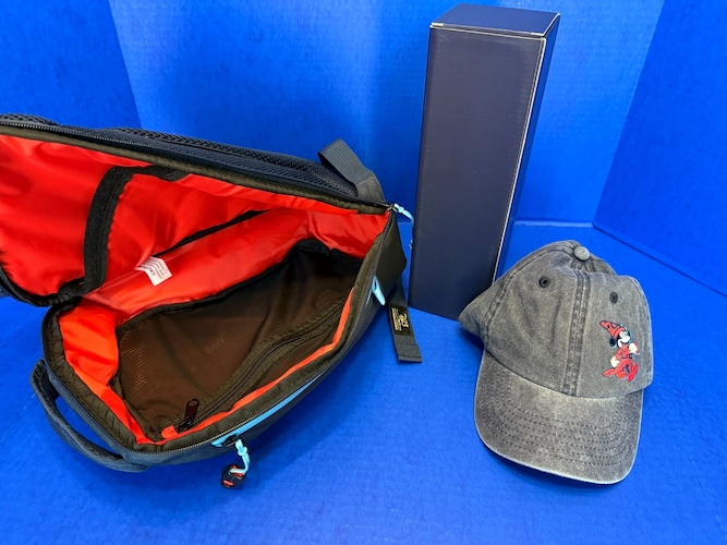 I’ll admit that this was the gift I was least interested in, but seeing it in person, I’m sold on the quality of each item. This bundle includes a crossbody bag, water bottle, and chino cap. Everything comes nestled inside the bag, and the metal water bottle is further protected by a box and bubble wrap. What most impressed me about the bag is its versatility.