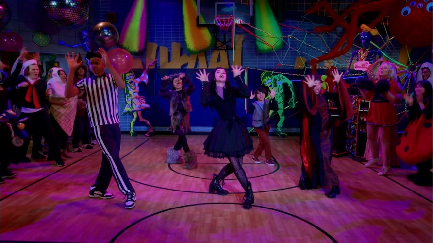 In the halls, the girls bump into Britney (Faith Hedley), who doesn’t have her costume yet because her seamstress is still working on it. Elijah (Shaun Dixon) passes dressed as a referee, complete with a choreographed routine. Demi tries out his scare skills — and fails. Vee shows him how it’s done by startling a flower-costumed girl (Audrey Kate Winter) so badly that she loses her petals. Soon rumors spread: Vee is scarier than she lets on.