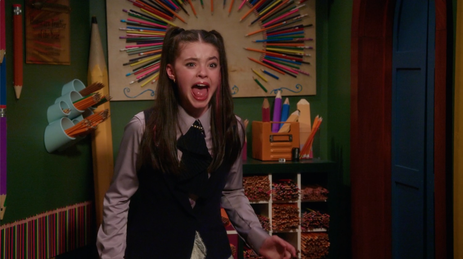 Dean Merriweather (Kim Coles) enters her office, surprised to see her window open. She goes to close it when she sees a foot behind her desk. Vee thinks fast, turning into a bat and flying around the room, distracting the dean so that Sophia can scamper out of the office. However, Merriweather grabs a broom and swats bat Vee into a closet, closing the door. Vee transforms back into a girl on the other side and realizes it’s a closet full of pencils! She screams, which prompts Dean Merriweather to open the closet door, surprised to see a student inside. Dean Merriweather threatens to expel Vee, who begs to stay. Out of desperation, she uses her mind control powers to make Dean Merriweather her biggest fan. It’s not clear if it works on her.