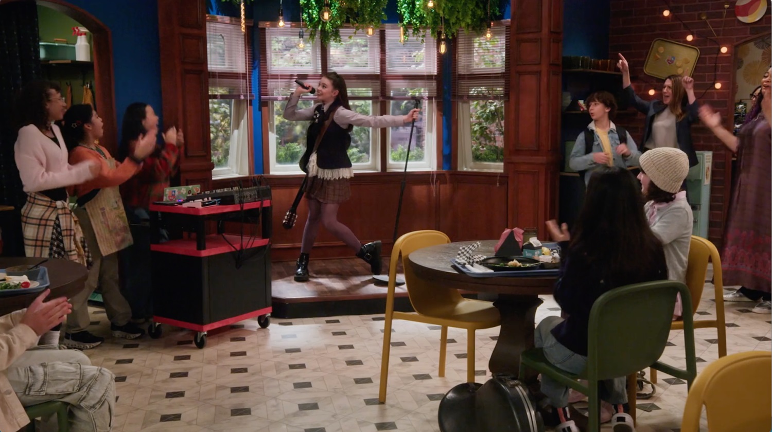 “We can’t go down without a fight," Vee tells Sophie when they get back to the cafeteria. She borrows a student's guitar and recruits Sophie to help her perform the song she was writing, “Where I Belong." Everyone loves the performance, including Vee’s parents, but they still think their daughter is in danger and want to stick to their plan of taking her home.
