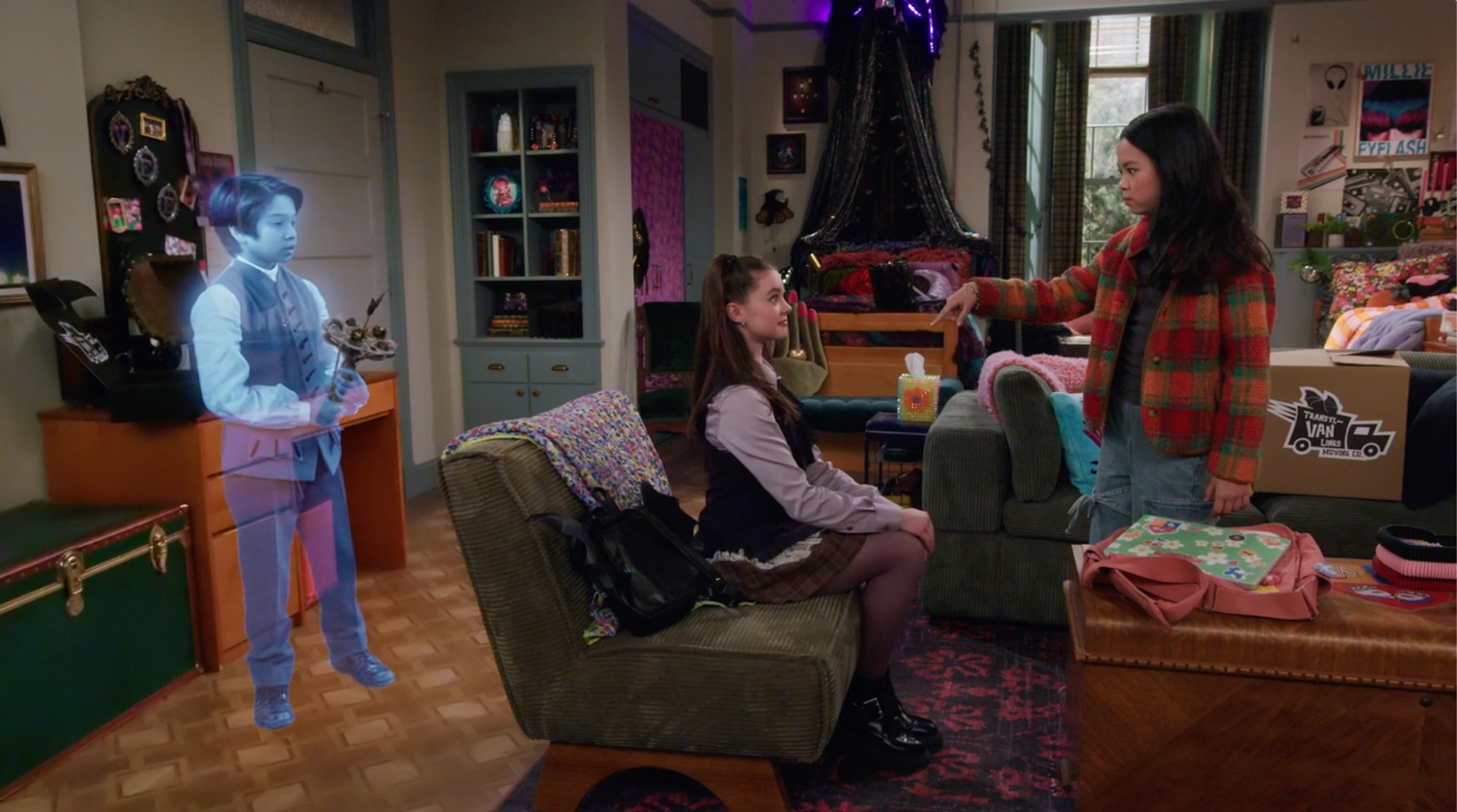 Sophie (Jiwon Lee) is sufficiently impressed as Vee (Kenzi Richardson) uses her super speed powers to decorate their dorm. It seems like it’s going to be a great first day of school when Demi (Milo Maharlika) floats in with a ghost gram from the Vampire Council. Vee isn’t in a hurry to open it, but Demi reminds her that as the first vampire allowed to leave Transylvania in over 300 years, she needs to take this seriously. Opening the chest, the message plays through Demi, a description of another item in the chest, a Van Helsing detector. Vee has to explain what a Van Helsing is to Sophie and defends her desire to follow her music dreams instead of spending her life hiding. When Elijah (Shaun Dixon) knocks on the door to escort the girls to class, Demi hides. He doesn’t see that the device began to light up.