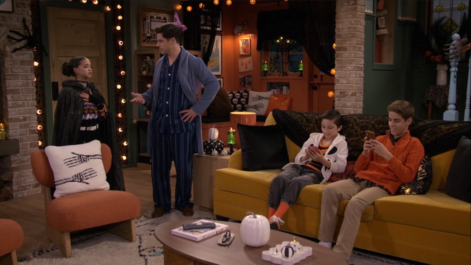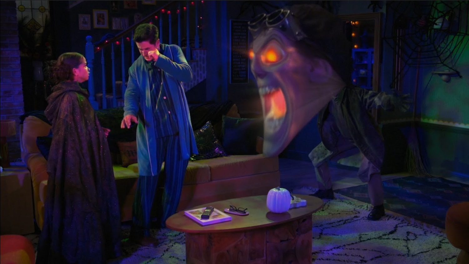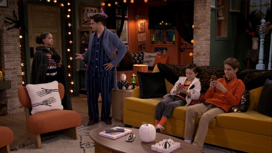 Halloween kicks off at the Russo house with pranks in full swing. At midnight, Roman (Alkaio Thiele) and Milo (Max Matenko) sneak into Billie’s (Janice LeeAnn Brown) room to spook her. Their sister rises from bed glowing eerily, frightening Roman, only for Milo to reveal he was in on it — glowing, too, when Roman turns around. The prank works a little too well when Roman’s scream wakes Justin (David Henrie), who rushes in and is also scared by the sight of the ghosts.