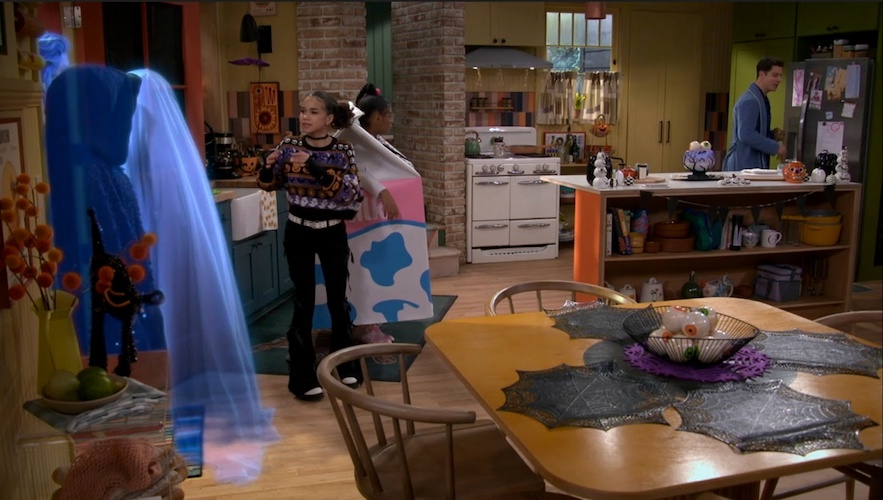 Billie is determined to throw the ultimate Halloween party, complete with real ghosts ordered through GhostMates. Winter (Taylor Cora) squeezes into the kitchen in a milk carton costume, having misheard “scary" as “dairy." Billie brags that she’s summoning actual spirits from the wizard world. Justin stumbles in for coffee, and Winter encourages Billie to get Justin’s approval to have ghosts at the party. Just as he says no, they appear at the back door behind his back. When Justin turns and sees them, he shuts it down. “No ghosts, no haunted house," he insists. Billie sheepishly apologizes for not asking first, but he heads back upstairs after an unrestful night to take a nap.