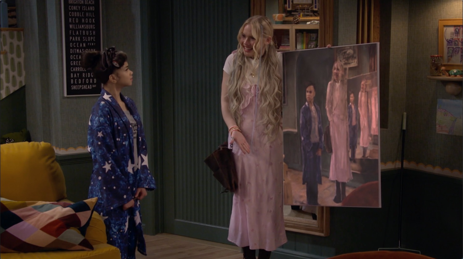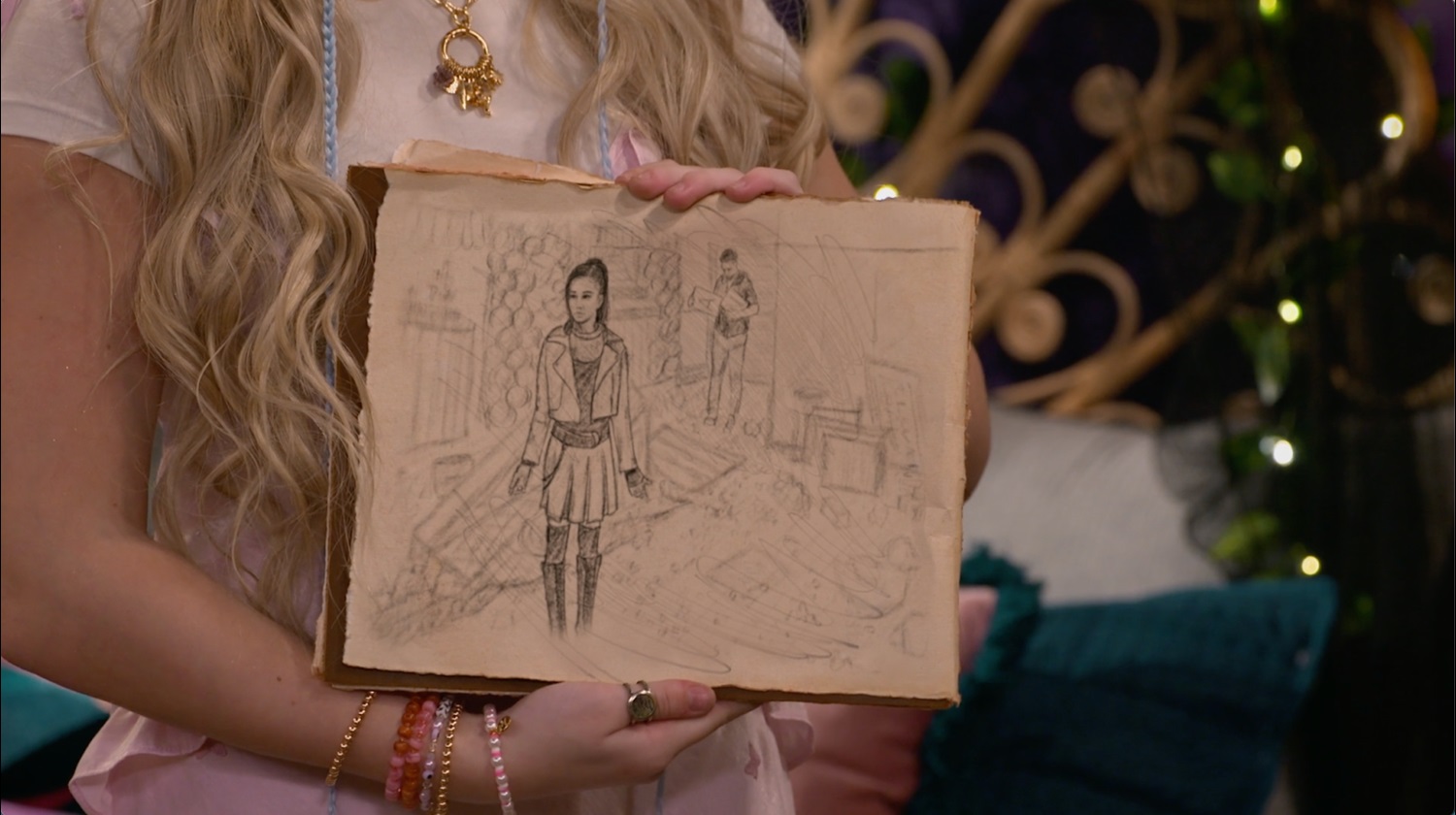 Before they can return to bed, someone steps through the mirror: Piper (Freya Skye), an oracle who paints the future. She shows Billie a sketch of the very scene they’re living in. Piper never knows how or when her visions come true — they happen while she’s in a trance. Right on cue, Piper freezes and sketches a drawing of Justin riding a bull like a cowboy. Giada laughs it off, until Justin strolls in holding a cardboard cutout of exactly that. He frets that Mr. Laritate won’t appreciate his carnival theme. Piper starts to introduce herself as an oracle, but Billie quickly fibs that she’s just there to help with carnival prep. She doesn’t want to give Justin any more stress.