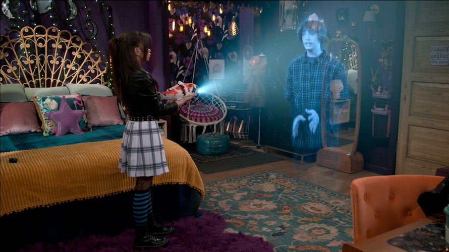 When Milo accidentally spills a glowing potion on Billie, Alex whisks it away before it explodes, but a familiar fish voice starts yapping from Billie’s bag. She covers quickly and tells Justin she’s going to look at the view. Before she can sneak out, he demands her wand, knowing that without it, she can’t run off.