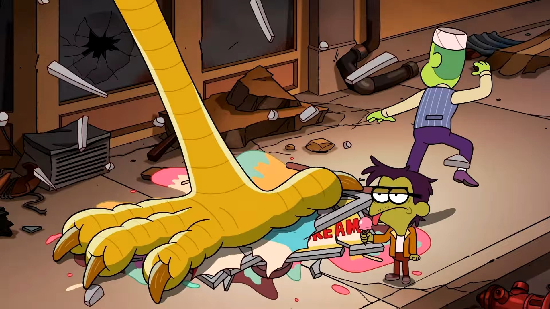 This launches us into our various adventures. Cricket and Remy are going to try and launch that chicken into space, recalling their very first adventure together and instead find themselves at Big Tech where the chicken gets enlarged to a monstrous size that sees our friendly duo jump into a pair of mech suits in a Kaiju battle that really ruins Gregly’s day. To dispense of the chicken, Cricket kicks the chicken into space, where it accepts his fate burning into the sun and causing the skies of Big City to rain fried chicken.