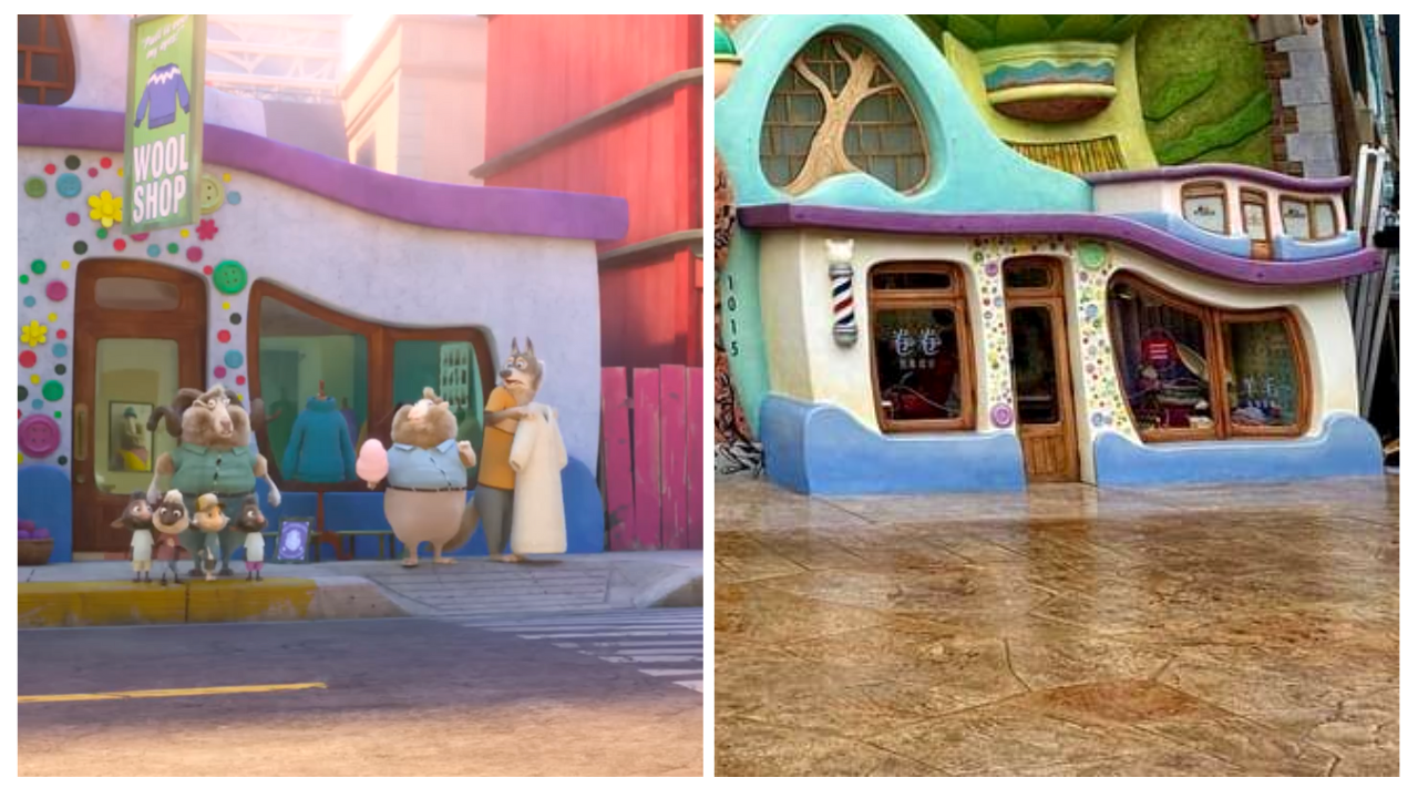 Shanghai Disneyland’s City of Zootopia opened in 2023, bringing to life locations from the first film, but also adding some new ones of its own. The sheep barber shop from the car chase sequence and the elephant fitness center Gym Trunks above Nick Wilde’s apartment were created for the land and ended up in the film.
