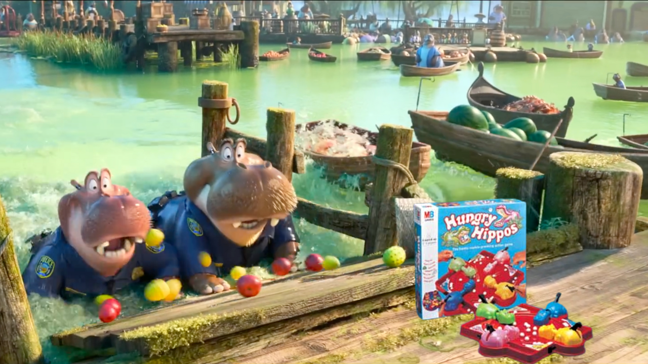 When hippo ZPD officers Higgins and Bloats chase Nick and Judy through the water, the dock to the tube station breaks, and a basket of fruit falls down the inclined dock. Both hippos begin chomping on the round fruit, an homage to the popular Milton Bradley board game.