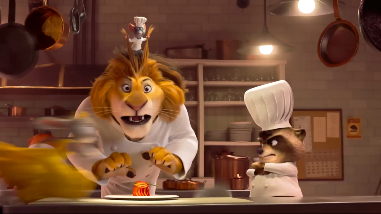 At the Zootennial Gala, as Judy chases Gary De’Snake through the kitchen, a lion chef is preparing ratatouille. As his chef’s hat is knocked off, it’s revealed that he had a rat under his hat pulling on his mane, the real chef of the dish, a parody of Pixar’s classic.