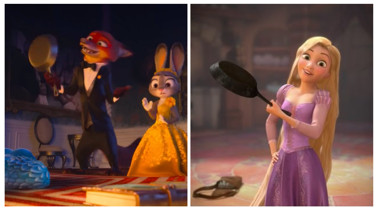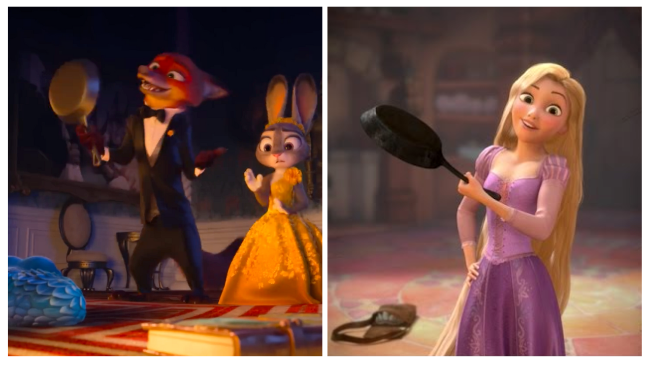 When Nick catches up to Judy, he grabbed an object in the kitchen to use to knock out Gary - a frying pan. Byron Howard previously revealed that this is the exact same frying pan that Rapunzel used to knock out Flynn Rider in Tangled, and it gets used again in the third act against Pawbert Lynxley.