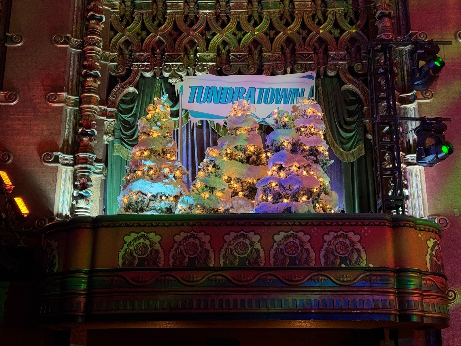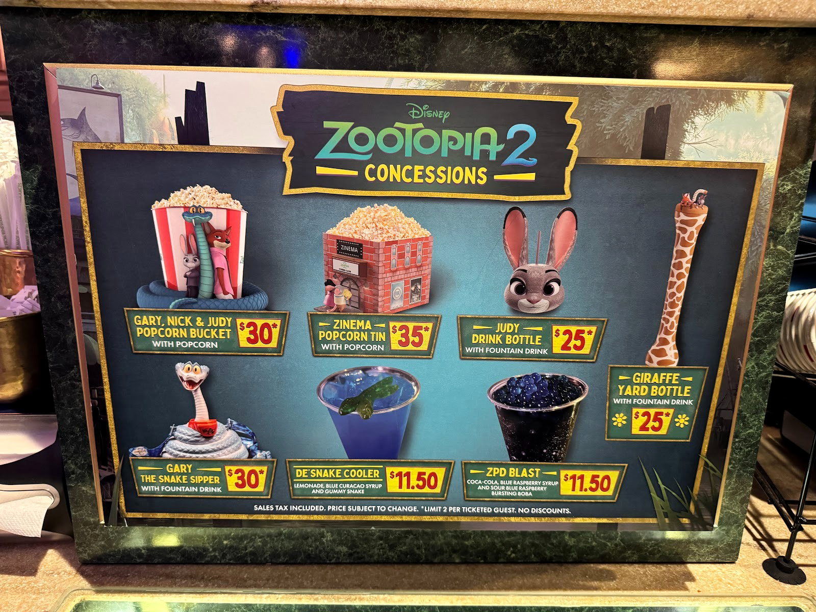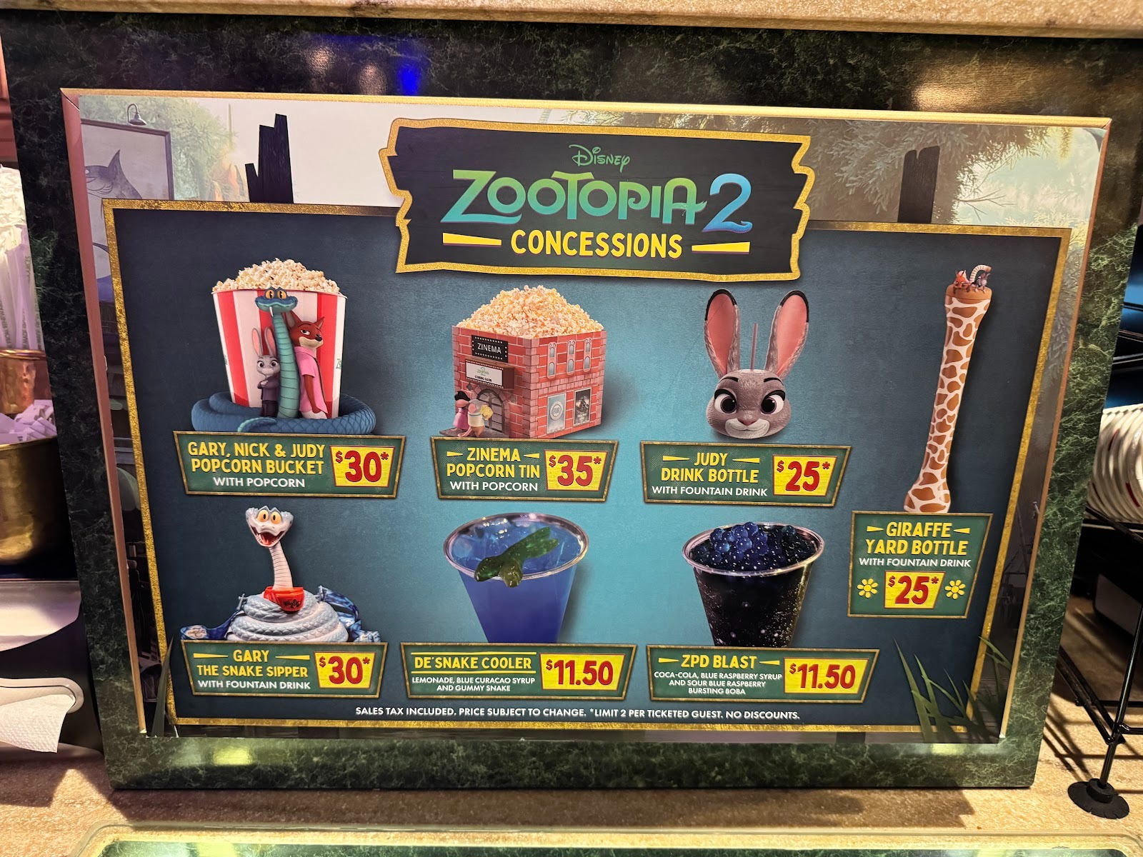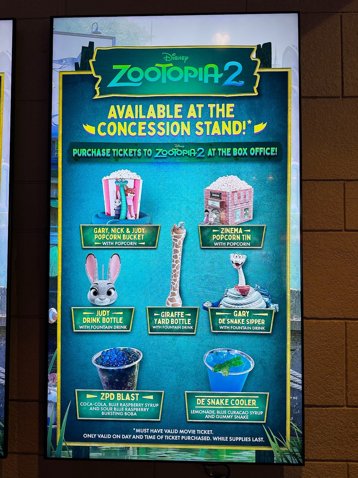 Inside the theater itself, more decor is staged further immersing moviegoers into the Zootopia 2 atmosphere, with the upper balconies featuring billboards and decor themed to locales in the movie - Tundra Town and Marsh Market.