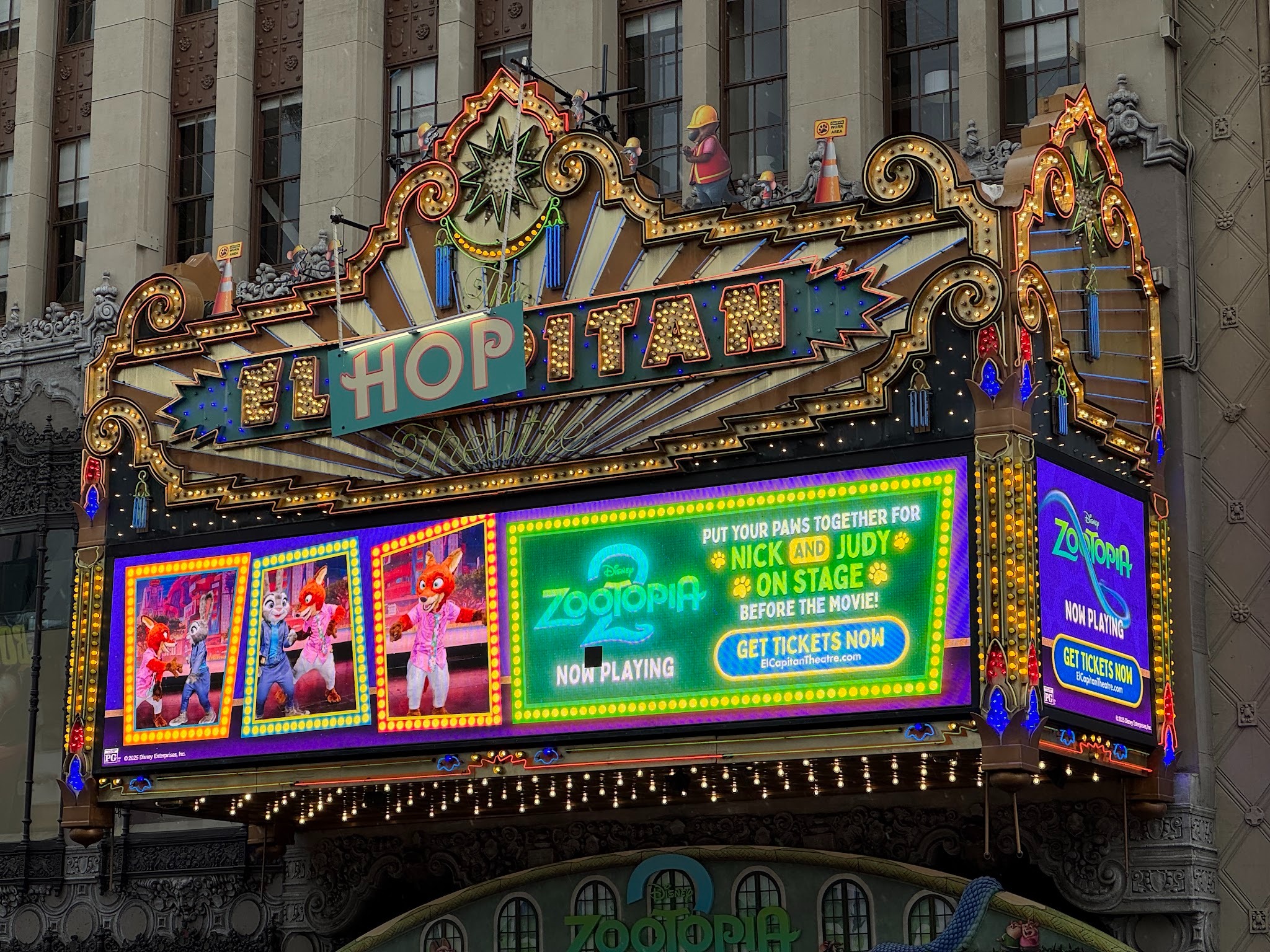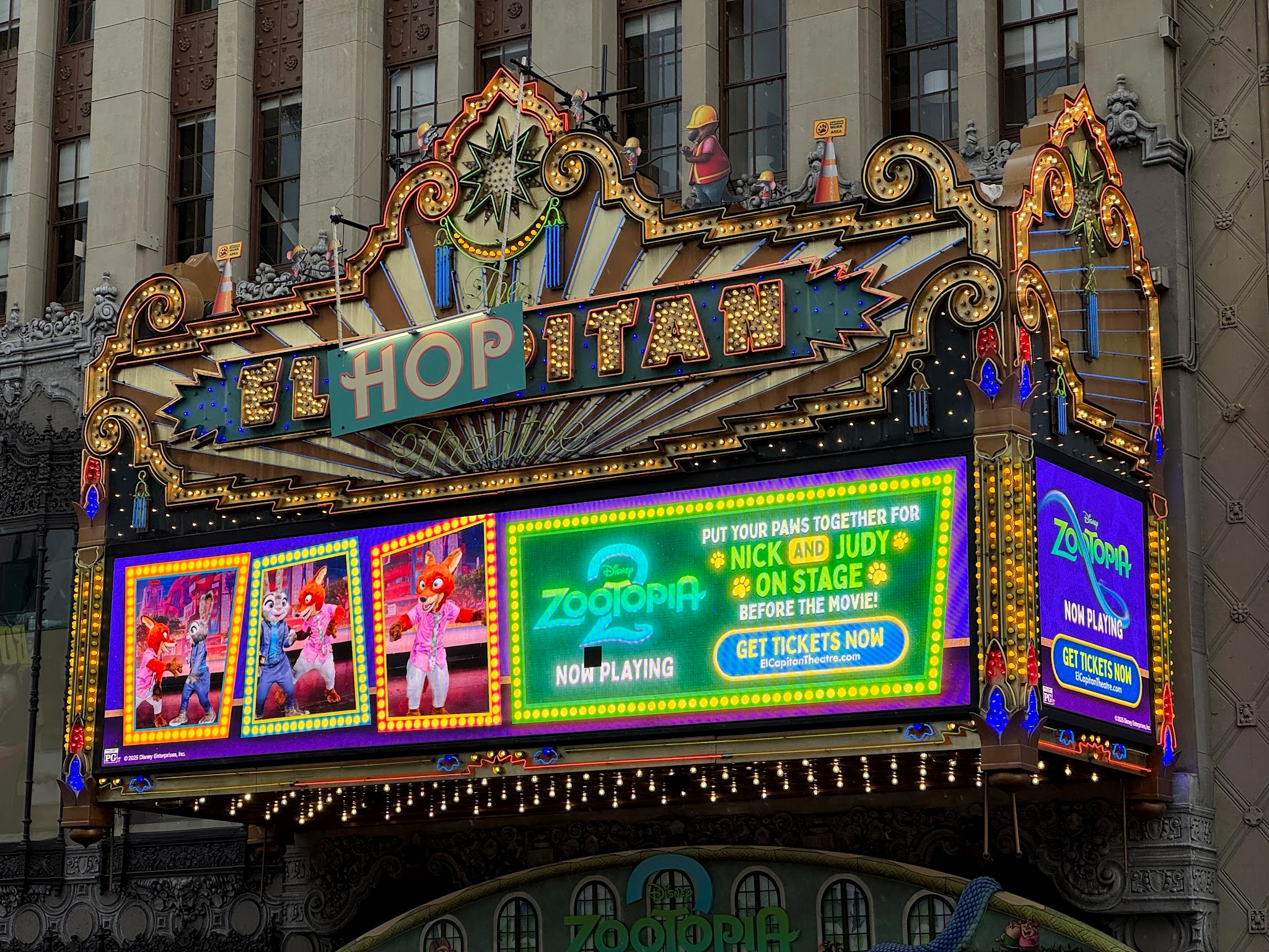 Or should we say, the El “Hop”itan Theatre, as the landmark marquee outside has been taken over by some Zootopia-esque fun, with a temporary sign revealing the new name of the classic movie palace.