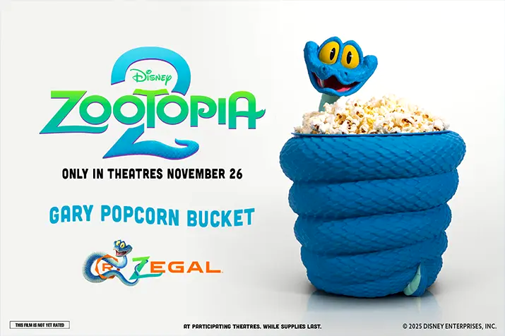 Those visiting Regal Theatres can get a sculpted popcorn bucket featuring Gary the snake from Zootopia 2, coiled up perfectly to hold popcorn.