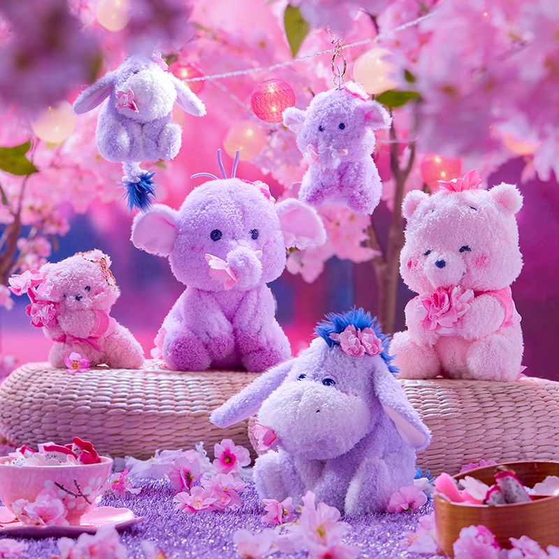 A new collection of plush from Disney Store Japan has arrived stateside, and these cuties feature a cherry blossom—Sakura—theme. Softly colored pinks and purples create a floral scheme that’s perfect for springtime displays.
