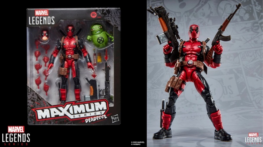 The next major release in the premium Marvel Legends Maximum Series line is none other than Wade Wilson himself, Deadpool. This figure is loaded for battle with an impressive 24 accessories along with a figure of Doop, the strange, green, floating member of X-Statix, complete with a floating display stand.