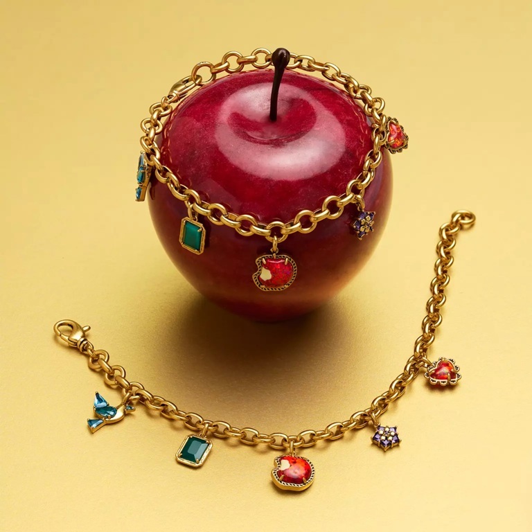 This bracelet features a gold finished chain, highlighting charms shaped as a poison apple, a heart, a bird, a rectangle, and a star. You can grab the $98 accessory here.