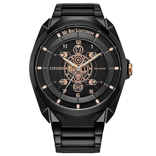 - Black dial with golden Marvel icons including Spider-Man, Iron Man, Hawkeye, Captain America, Captain Marvel, Thor, Black Widow, Hulk, Black Panther, and Dr. Strange