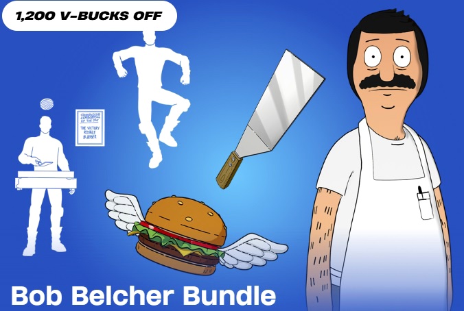 Saving 1,200 V-Bucks, the Bob Belcher bundle arrives with the Bob Belcher costume, Bob’s Spatula pickaxe, Burger of the Day and Bob’s Happy Dance emotes, and the Flying Burger backbling.